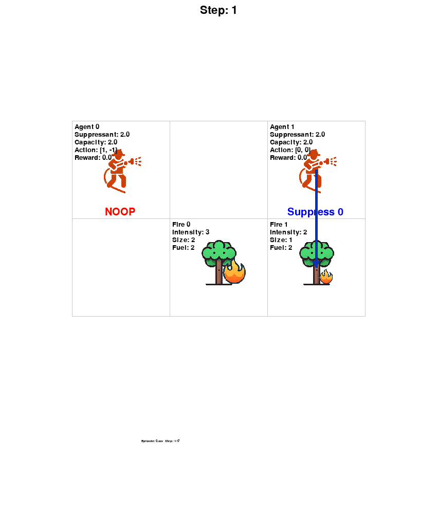 Suppression Mechanism: Agents apply suppressant to the fire to reduce its intensity. However, suppressant is a finite resource. When an agent runs out of suppressant, they must leave the environment to refill at a designated station before returning to continue fighting fires.